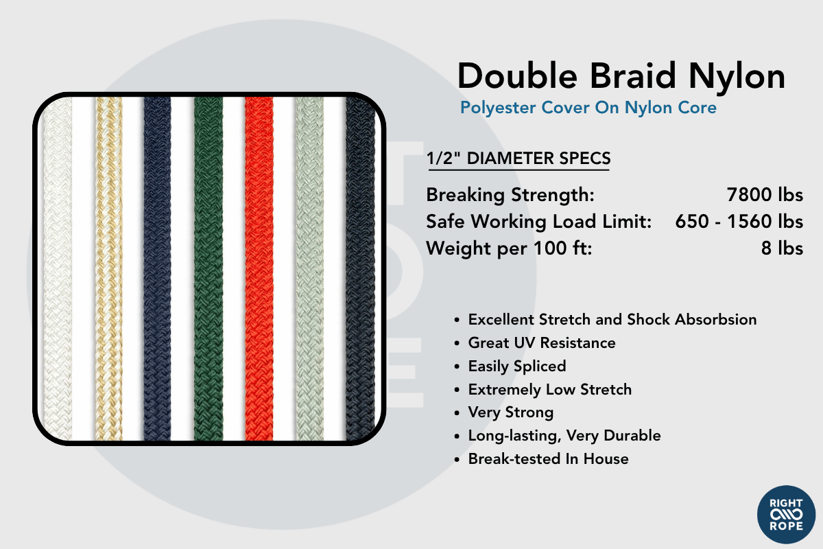 This is why people search “nylon vs polyester rope stretch” or “best rope for shock absorption.” Nylon, especially in a double braid construction, hits the balance most people need. It stretches under load to absorb shock but maintains its integrity.